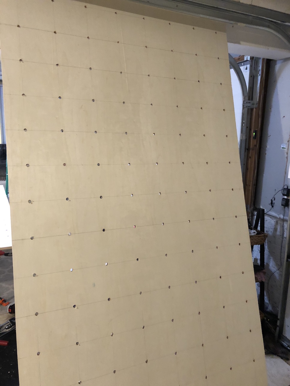 Planning the positions for the rock holds is tricky. More pre-drilled holes provide flexibility with re-positioning and spacing of the rocks. An even grid is aesthetic, but may not be feasible b/c of the math. The most challenging aspect is ensuring there is a space behind the plywood board for the bolts (holding the rocks on) to protrude out so the rocks are securely fastened.