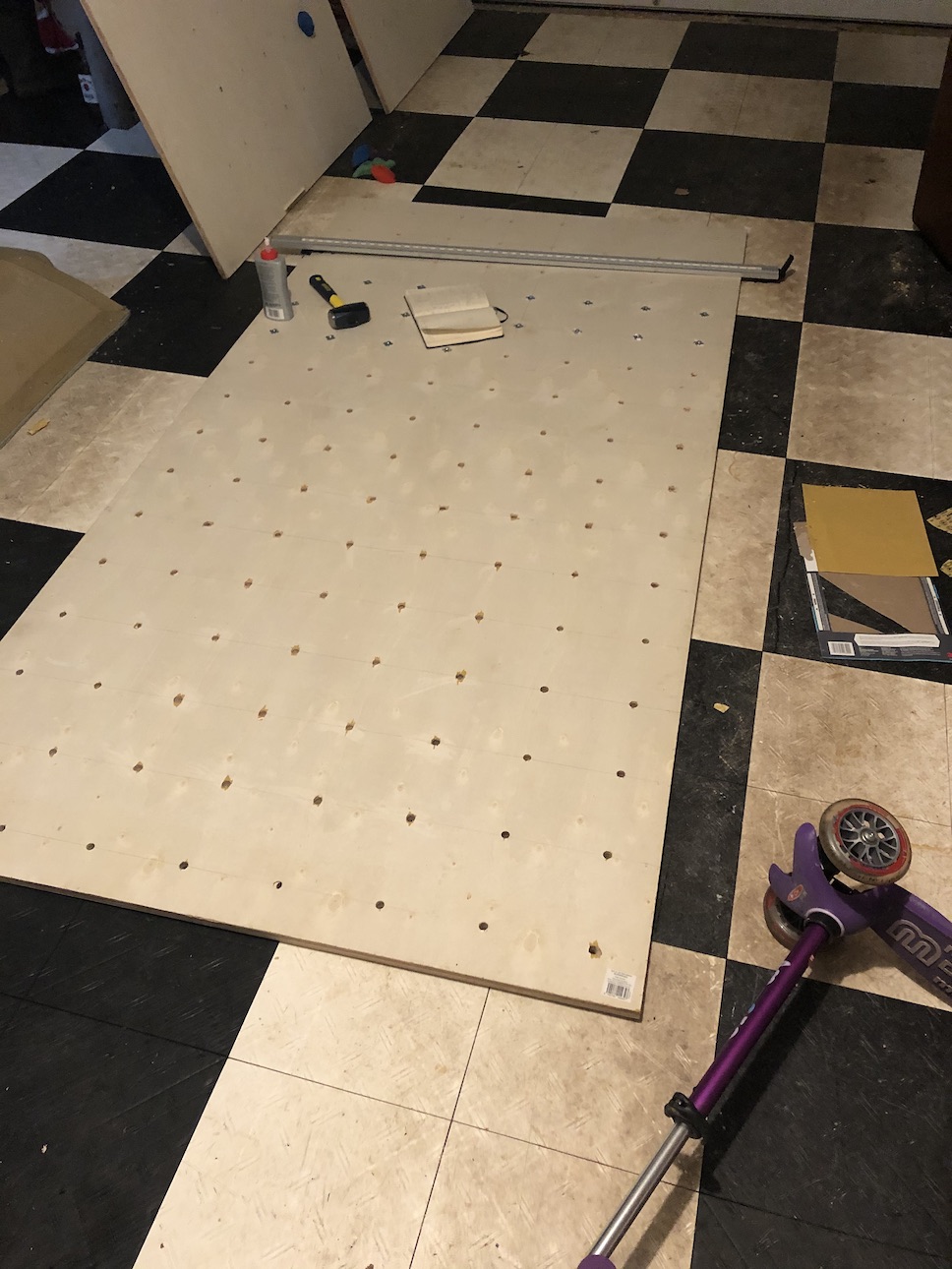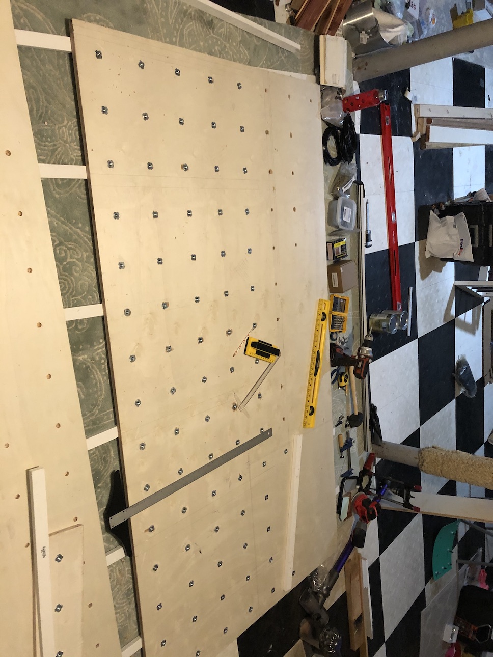 Wood: - 3 @ 4'x8' ACG plywood boards, 3/4" thickness. - 14 @ 1" x 3/4" x 8' (for spacing plywood from drywall) - get a few good 1"x3"x3/4" x 8' poplar boards (cleats) Screws: - bolts (i used #14 x 4inch, would go for 4.5-5" and possible thicker) (eg) - long boys (I'd use thicker, but i used #10x5" eg) - short ones (screw the spacers into the plywood, 1" or 1 1/8") Drilling: - 2 @ 1/2" forstner drill bits. Can try just 1 but it gets worn down. - a bunch of clamps (simply to hold boards for drilling) - I got a [link] to help ensure drilling straight holes. it helps some. Other: - Glue - T-nuts 3/8-16" 1/2" 4 prong (eg). Kids' sets are often wrong threading. - 3/8-16 socket head. Ensure compatible with T-nuts. (eg) - rocks - i used amazon and https://www.atomikclimbingholds.com/ (also this but don't use tnuts/bolts)